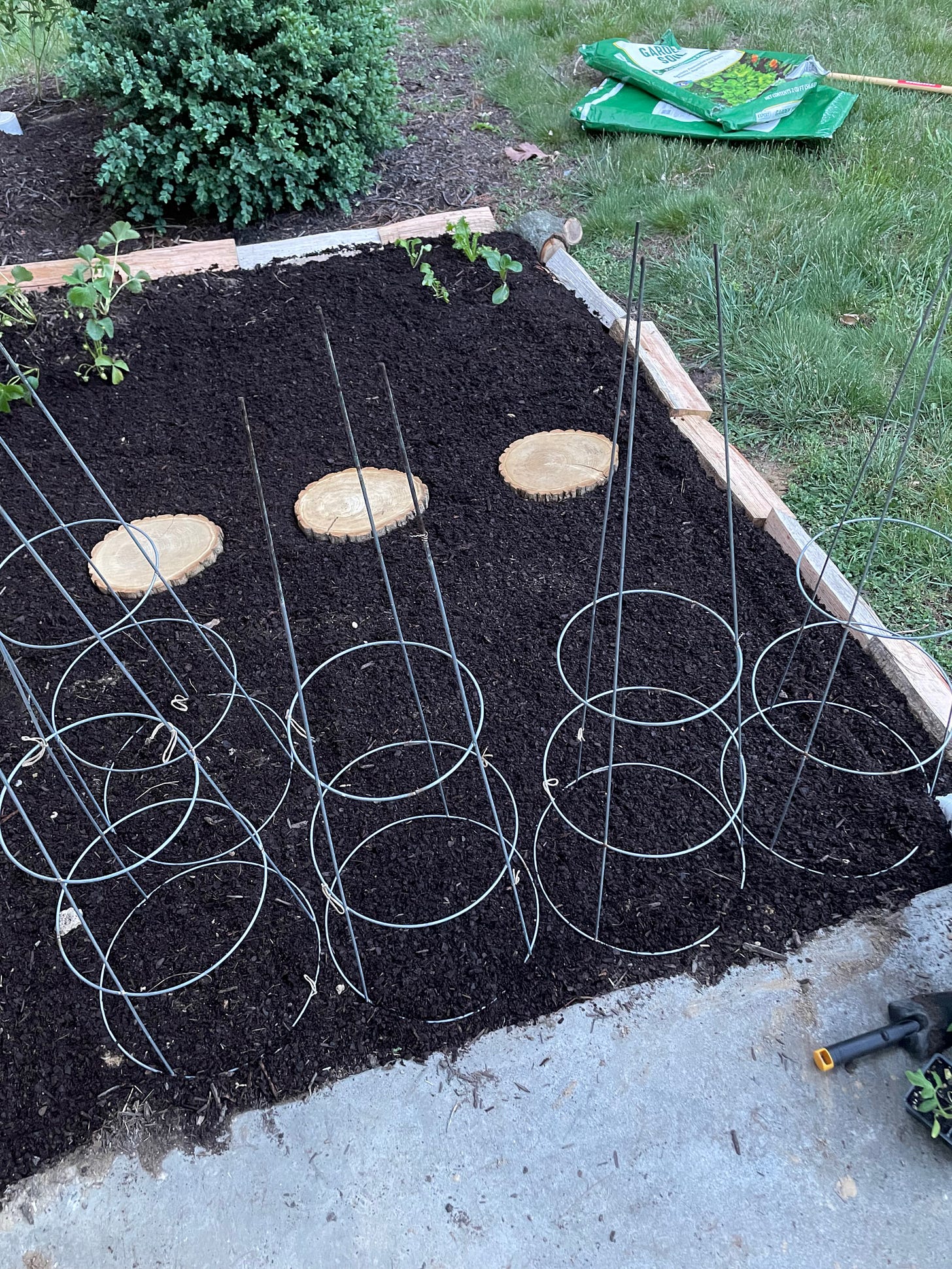 spindly strawberries, alarmingly-leaning lettuce, a trellis and tomato cage army.